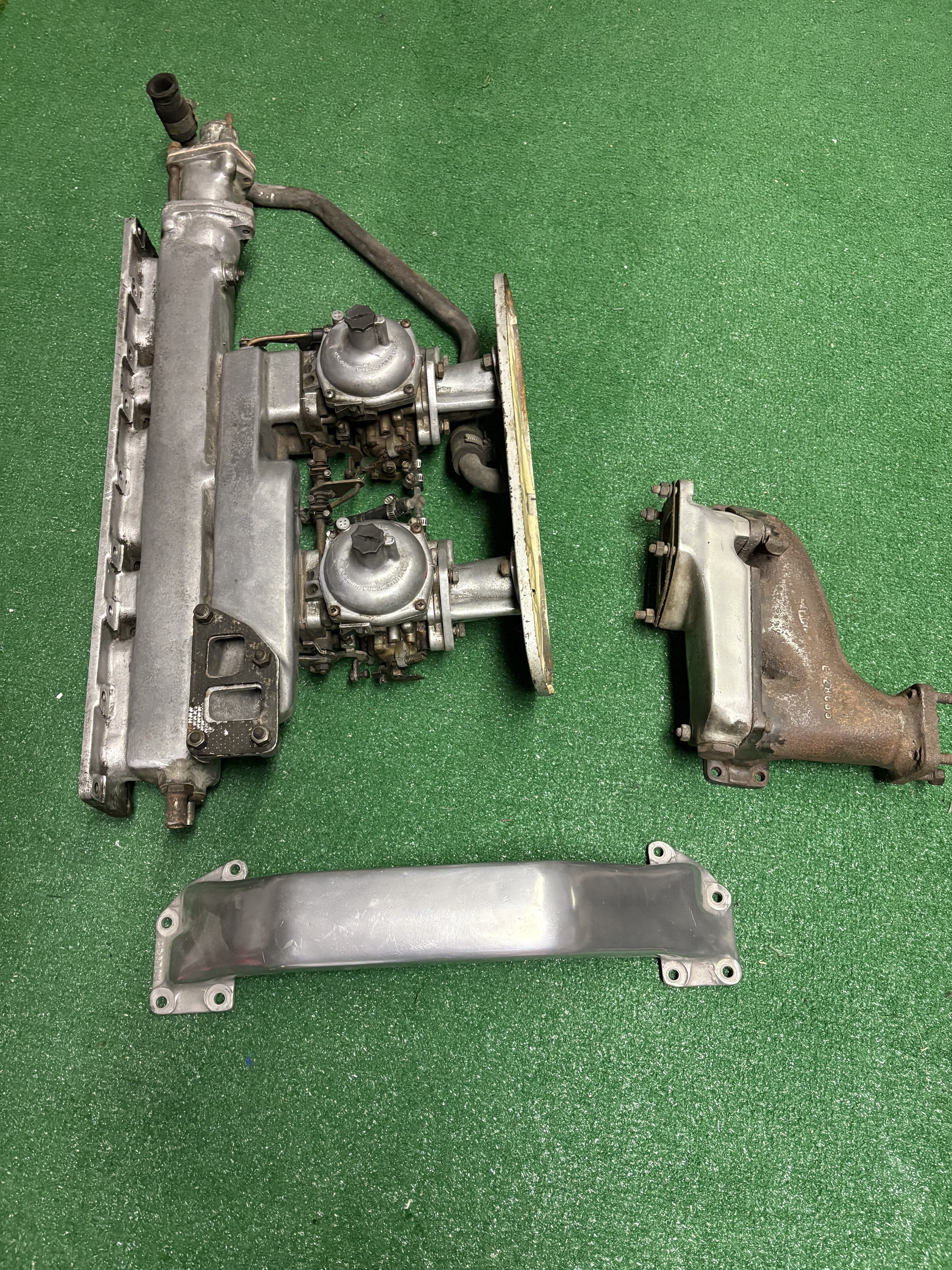 Complete intake, crossover pipe, rear exhaust manifold with adapter, and Stromberg 175 CD-2 carbs. This was from my 1968 S1.5 that I converted to 3 SU’s.