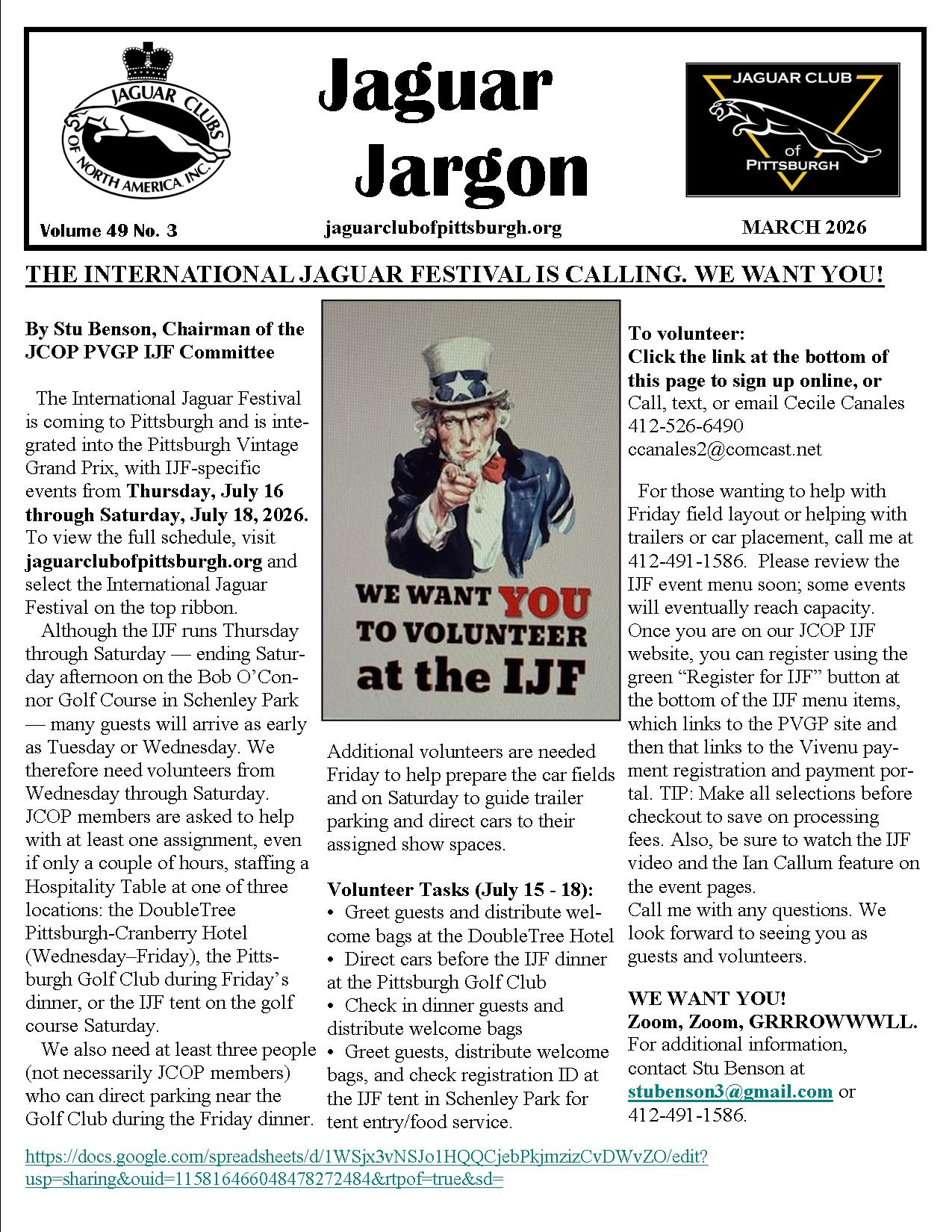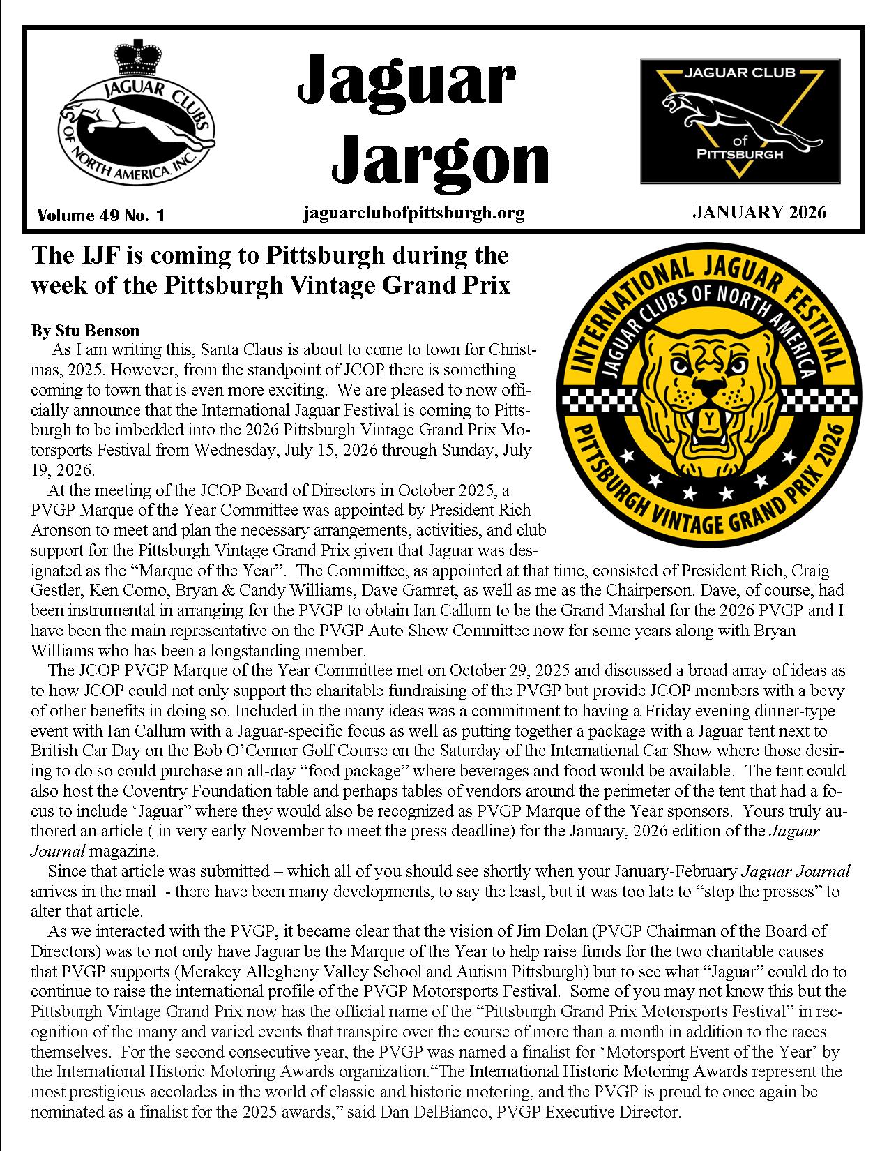 Jaguar Club Of Pittsburgh NC Region - Club #45 Formed: 1971 Members: 100 plus Jaguar Club of Pittsburgh is a friendly group that provides a schedule of events that all Jaguar enthusiasts can enjoy. Hardly a month goes by that there isn't some reason to get together, from tech sessions to dinners to drives to nice locations to car shows to Concours d'Elegance to weekend trips to interesting events and activities. We'd love to have you join us! Check out past Jaguar Jargon newsletters on our website to see the range of wonderful events we enjoy.
